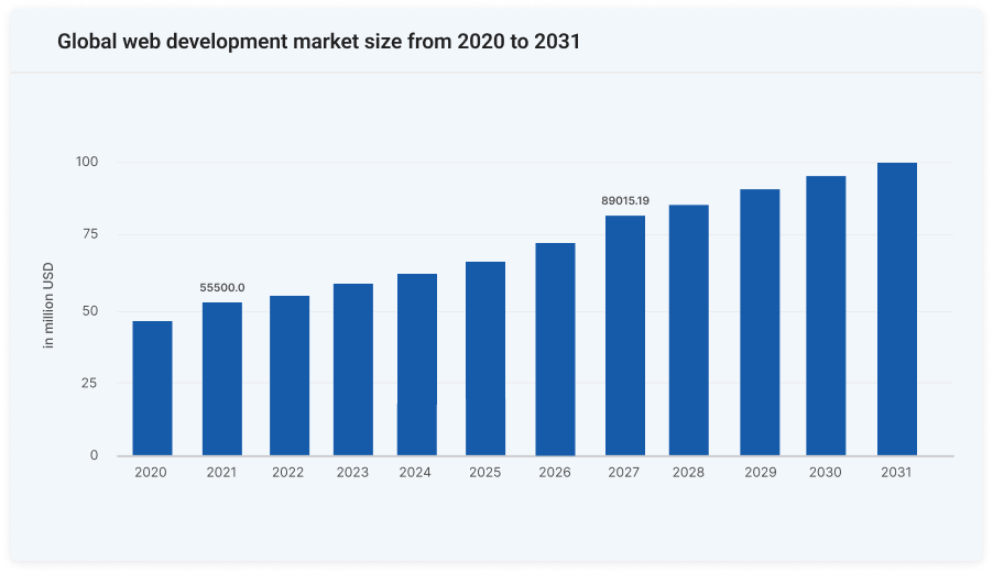 The global web development market size was roughly USD 55500.0 million in 2021. As per our research, the market is expected to reach USD 89015.19 million by 2027, exhibiting a CAGR of 8.03% during the forecast period.